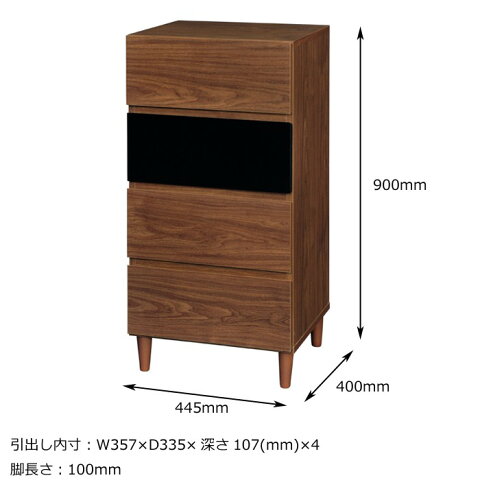 サイズ・容量 ◎チェスト9045■商品サイズ:W445×D400×H900mm■商品重量:20.5kg■梱包サイズ:W1100×D435×H125mm■梱包重量22.0kg規格■素材・成分:本体:プリント紙化粧繊維板、扉・引出し前板:UV塗装、脚部:天然木 美しい光沢仕上げの扉・引出しと落着いた色調のコンビネーションがモダンなシリーズ。